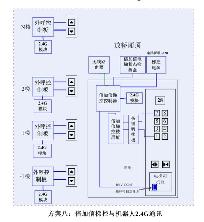 (1)機器人在電梯外,通過2.4G通訊發(fā)送指令倍加信梯控系統(tǒng),系統(tǒng)自動點亮上樓或下樓按鍵,實現(xiàn)呼梯功能。