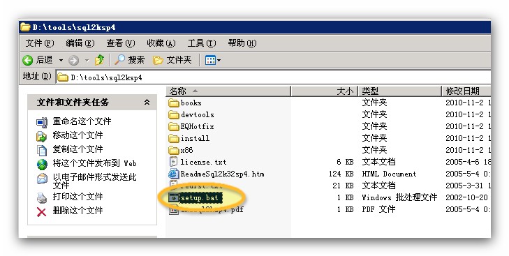 解壓sql2ksp4.rar這個壓縮包到當前路徑,點擊setup.bat進行安裝,注意很多人把解壓當成安裝,解壓了并不是安裝,一定要注意,解壓后需要到解壓目錄下執(zhí)行安裝。