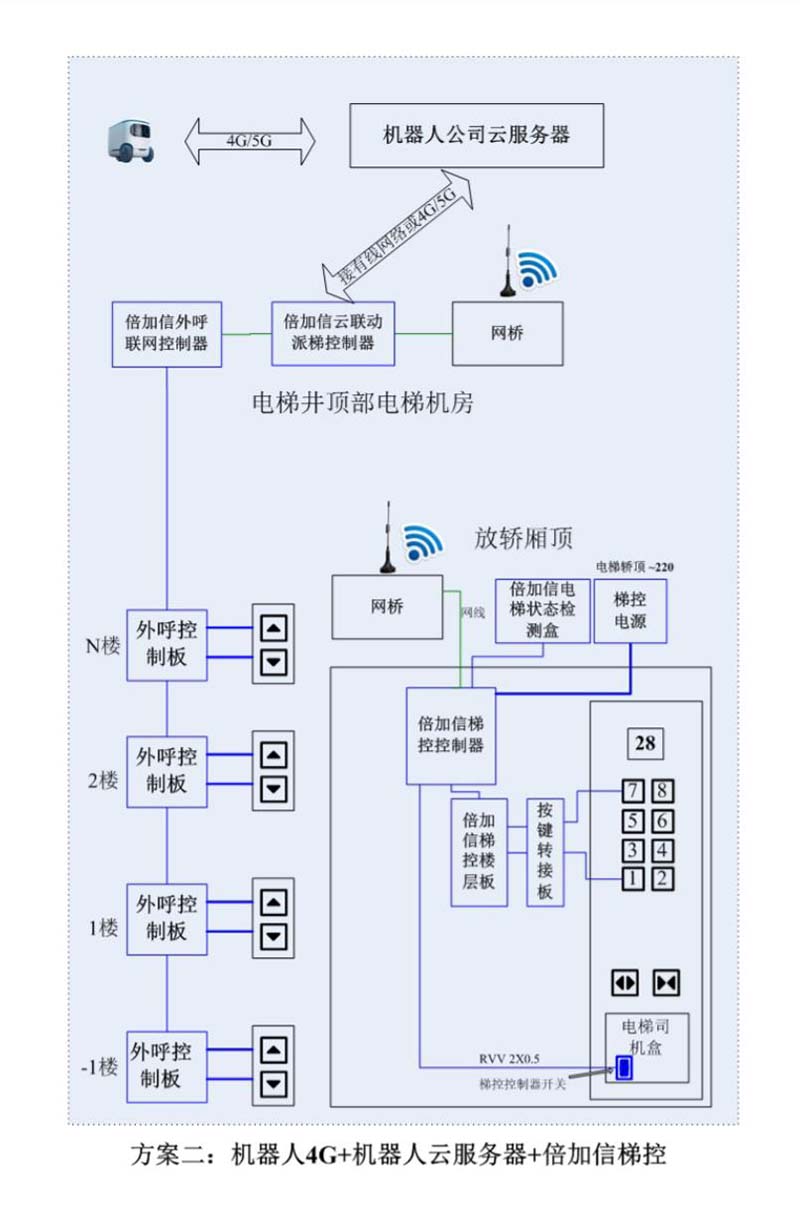 (1)機器人在電梯外,通個Wifi、藍牙、LoRa、Zigbee、2.4G、433M、語音或4G網(wǎng)絡(luò)等發(fā)送指令倍加信梯控系統(tǒng),系統(tǒng)自動點亮上樓或下樓按鍵,實現(xiàn)呼梯功能。