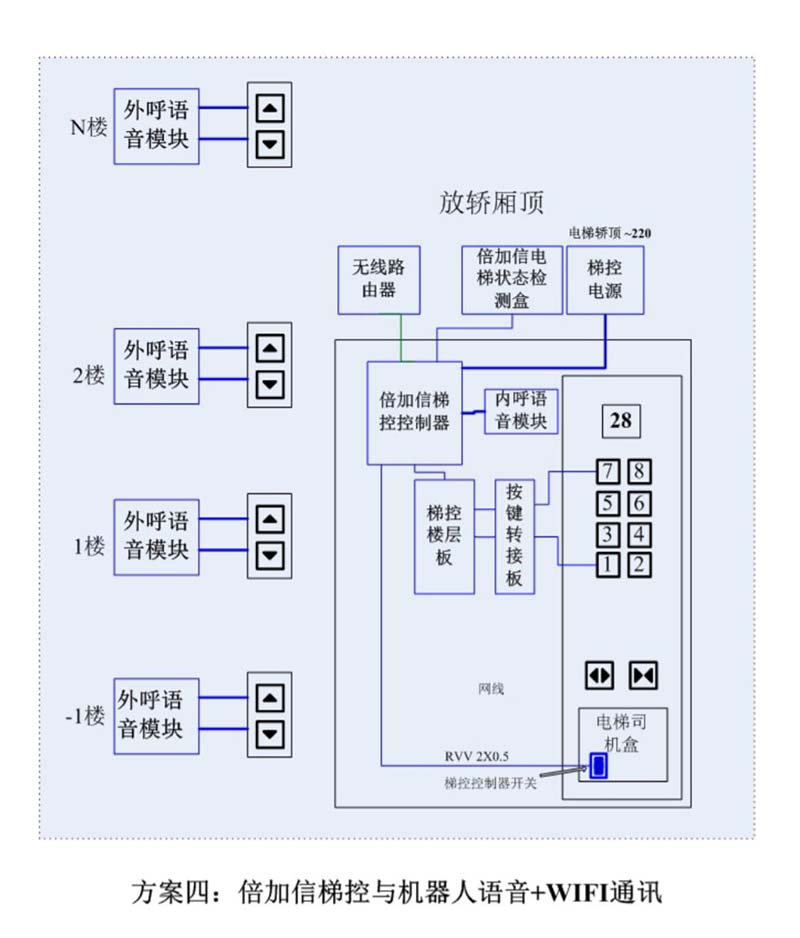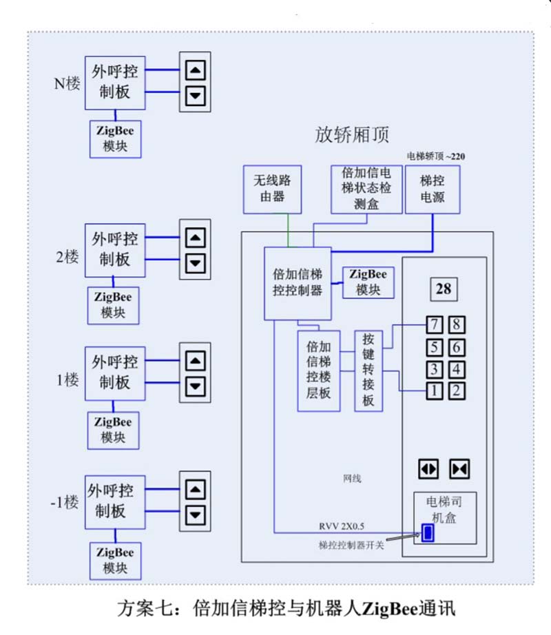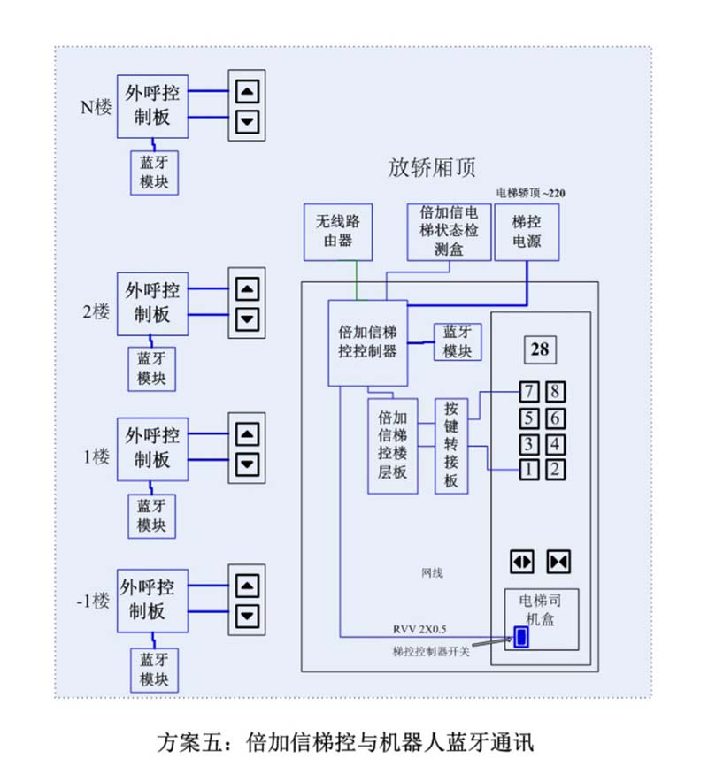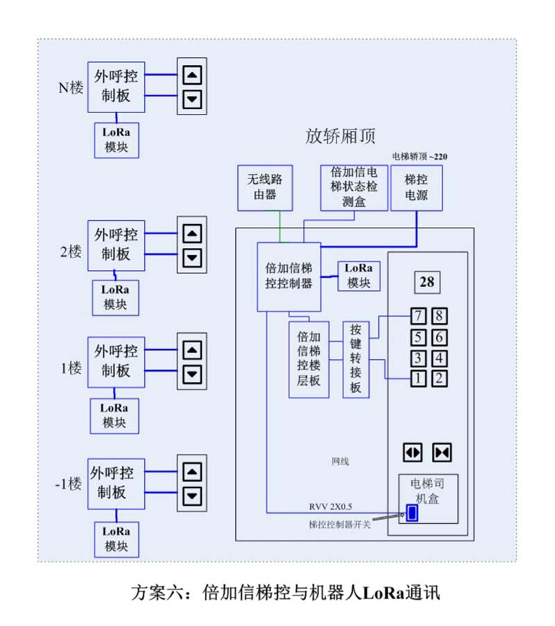 (1)機器人進入電梯后,通個Wifi或4G網(wǎng)絡(luò)發(fā)送指令給倍加信梯控云平臺,倍加信梯控云平臺收到指令后,將指令發(fā)給倍加信梯控系統(tǒng),倍加信梯控系統(tǒng)自動點亮對應(yīng)樓層按鍵,比如發(fā)去6樓指令,則6樓按鍵自動點亮,電梯送機器人員到6樓。