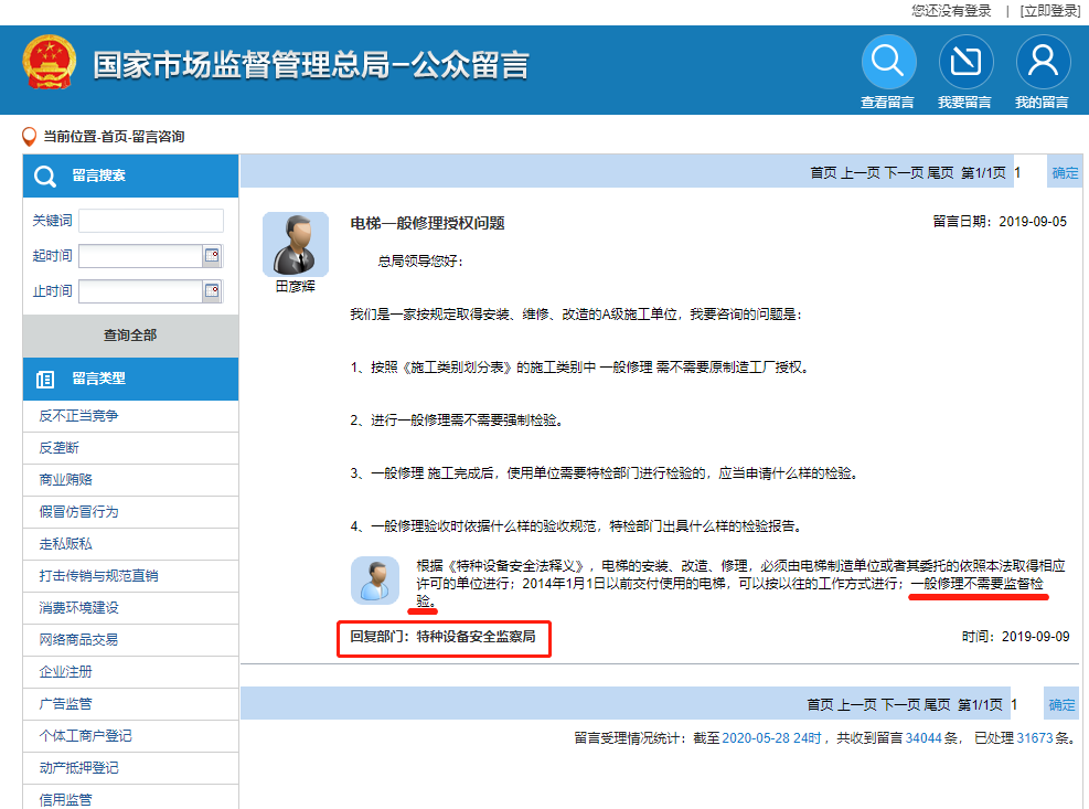 3、國家市場監督管理總局關于一般修理是否需要檢驗的回復: