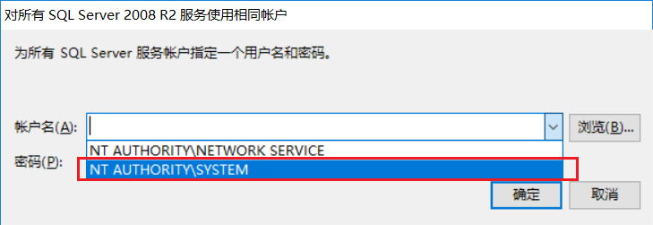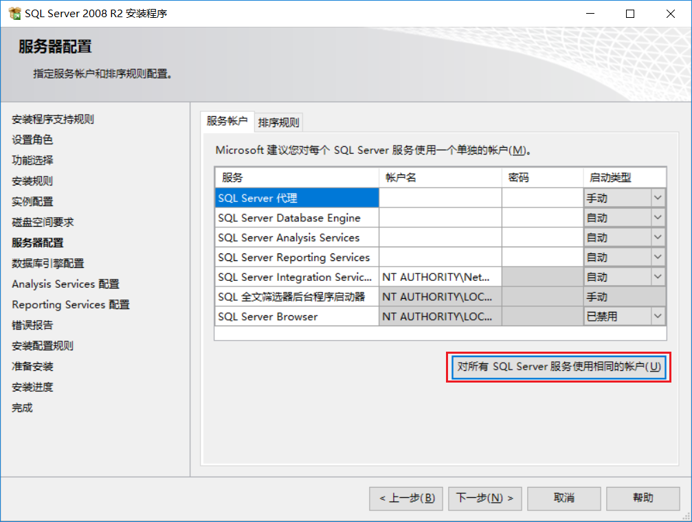 點擊,對所有SQL Server服務使用相同賬戶